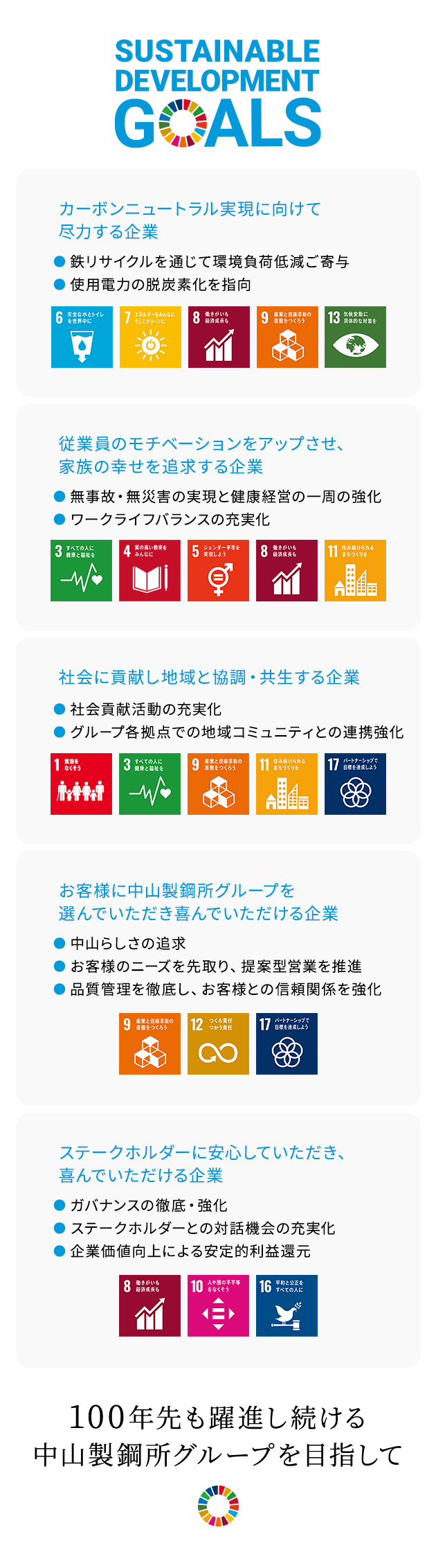 電気炉メーカーである強み、優位性を活かした成長戦略を実現すると同時に社会にとって不可欠な存在となり、100年先も躍動し続ける中山製鋼所グループを目指して取り組むべき5つのマテリアリティを特定しました。